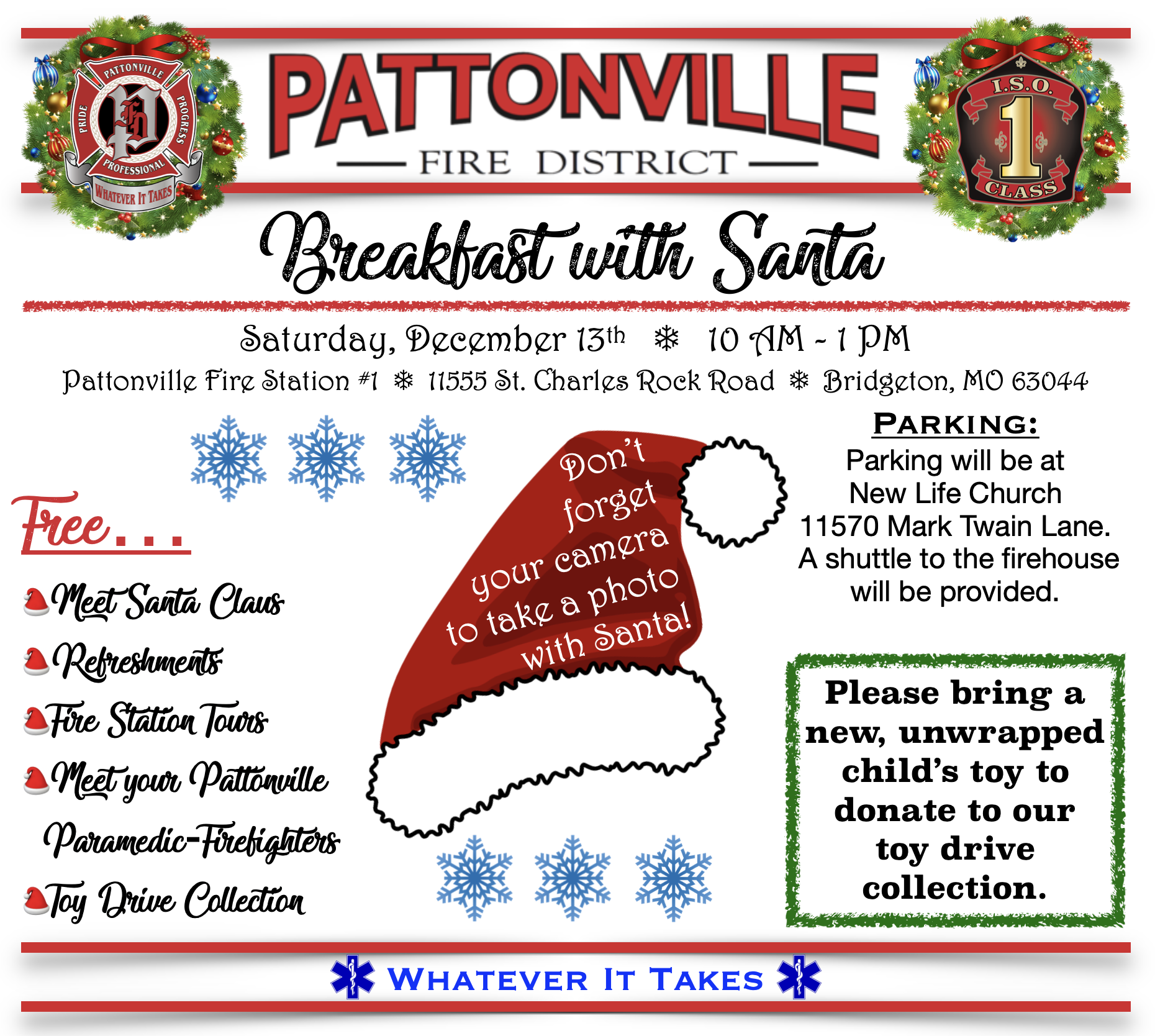 Our annual Breakfast with Santa event will be held on Saturday, December 13, from 10AM to 1PM at Pattonville’s Fire Station #1 located at 11555 St. Charles Rock Road in Bridgeton. Please come meet Santa, take a fire station tour, and enjoy light refreshments with our Paramedic-Firefighters! EVERYTHING IS FREE!!! We only ask that you bring along a new, unwrapped child’s toy to donate to our annual toy drive. All donated toys will be distributed to families in our community who could use a little extra help this Holiday Season.
