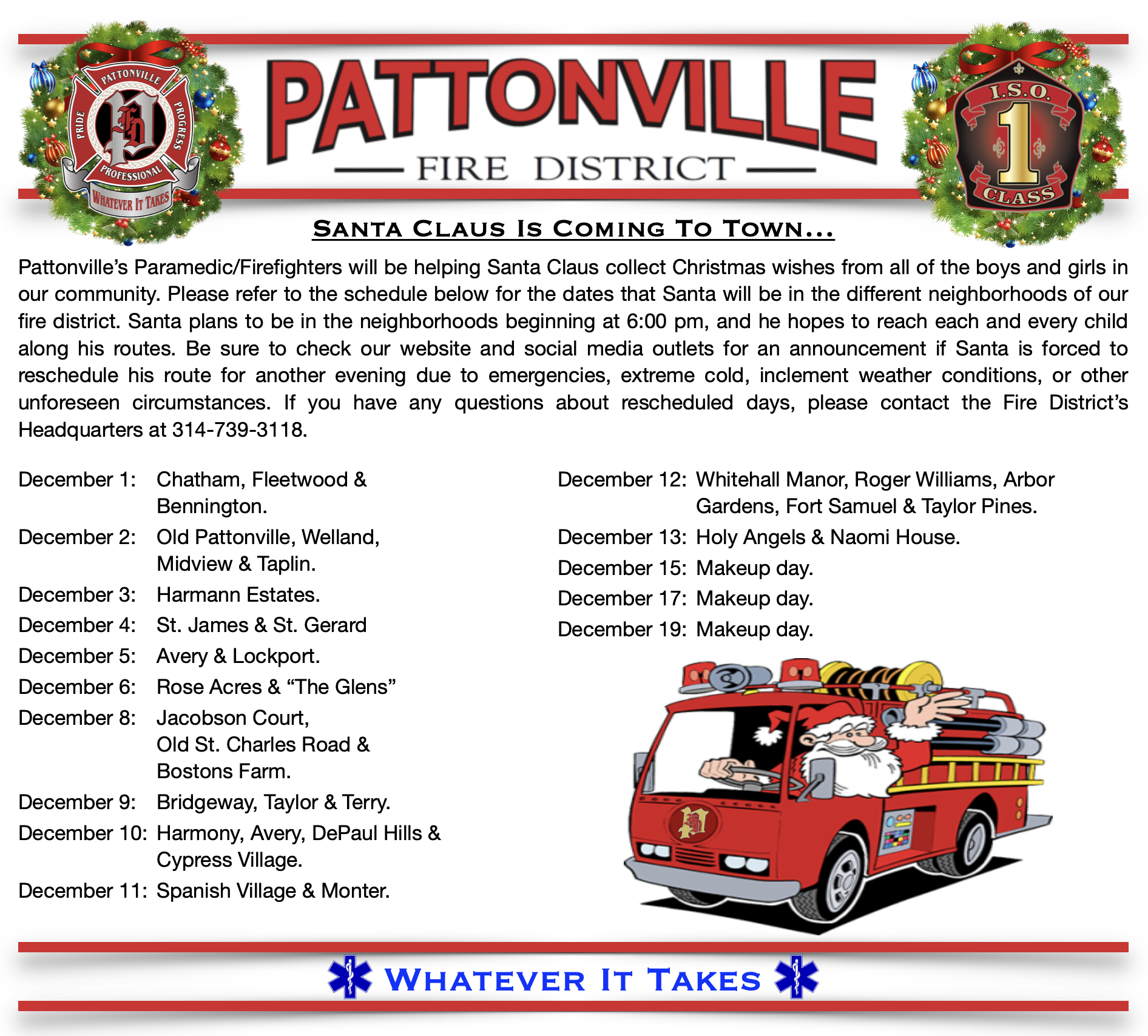 Pattonville’s Paramedic/Firefighters will be helping Santa Claus collect Christmas wishes from all of the boys and girls in our community. Please refer to the schedule below for the dates that Santa will be in the different neighborhoods of our fire district. Santa plans to be in the neighborhoods beginning at 6:00 pm, and he hopes to reach each and every child along his routes. Be sure to check our website and social media outlets for an announcement if Santa is forced to reschedule his route for another evening due to emergencies, extreme cold, inclement weather conditions, or other unforeseen circumstances. If you have any questions about rescheduled days, please contact the Fire District’s Headquarters at 314-739-3118.